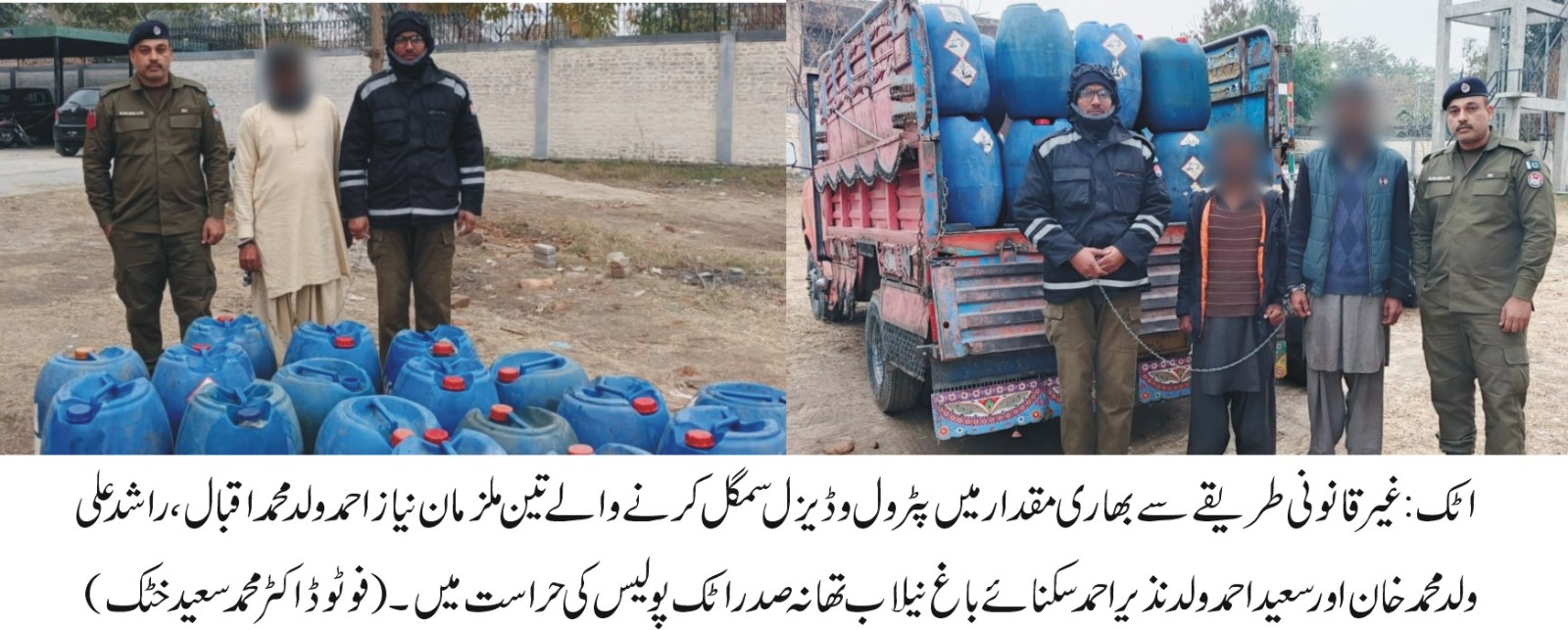 غیرقانونی طریقے سے بھاری مقدار میں پٹرول و ڈیزل سمگل کرنے والے تین ملزمان گرفتارتفصیلات کے مطابق دوران گشت تھانہ صدر اٹک پولیس کی ٹیم کو مخبر خاص نے اطلاع…